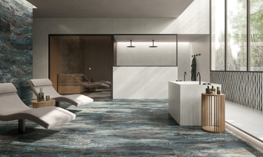 On Stage addresses the needs of interior design through vivid and refined colours inviting to create colour and textural combinations with prestigious sizes and two finishes. They result in original interactions of walls, floors and furniture elements.